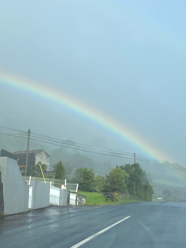 While enjoying our coffee, the most incredible rainbow appeared, and remained for at least 30 minutes. The pictures don’t even begin to show how intense it was, and how close it seemed. You’ll just have to use your imagination.