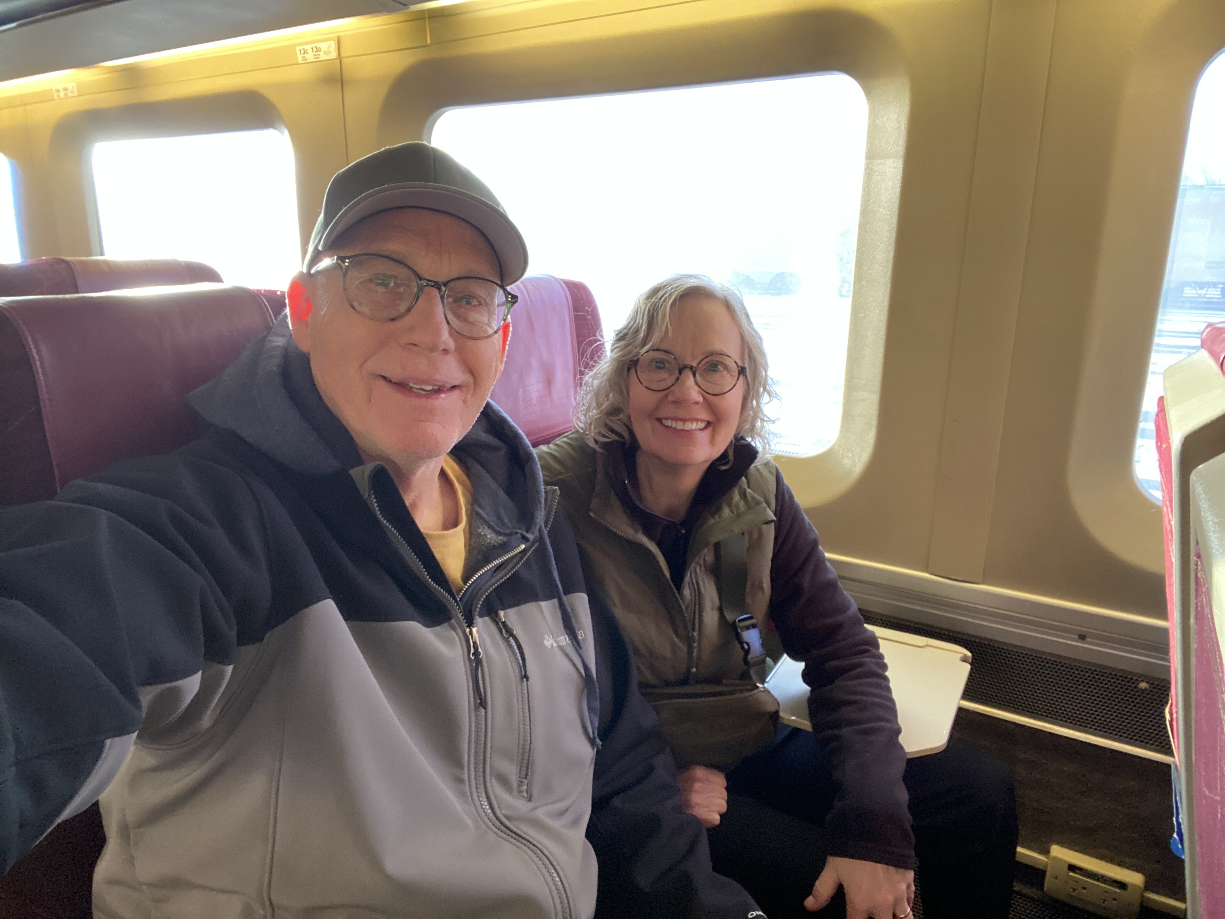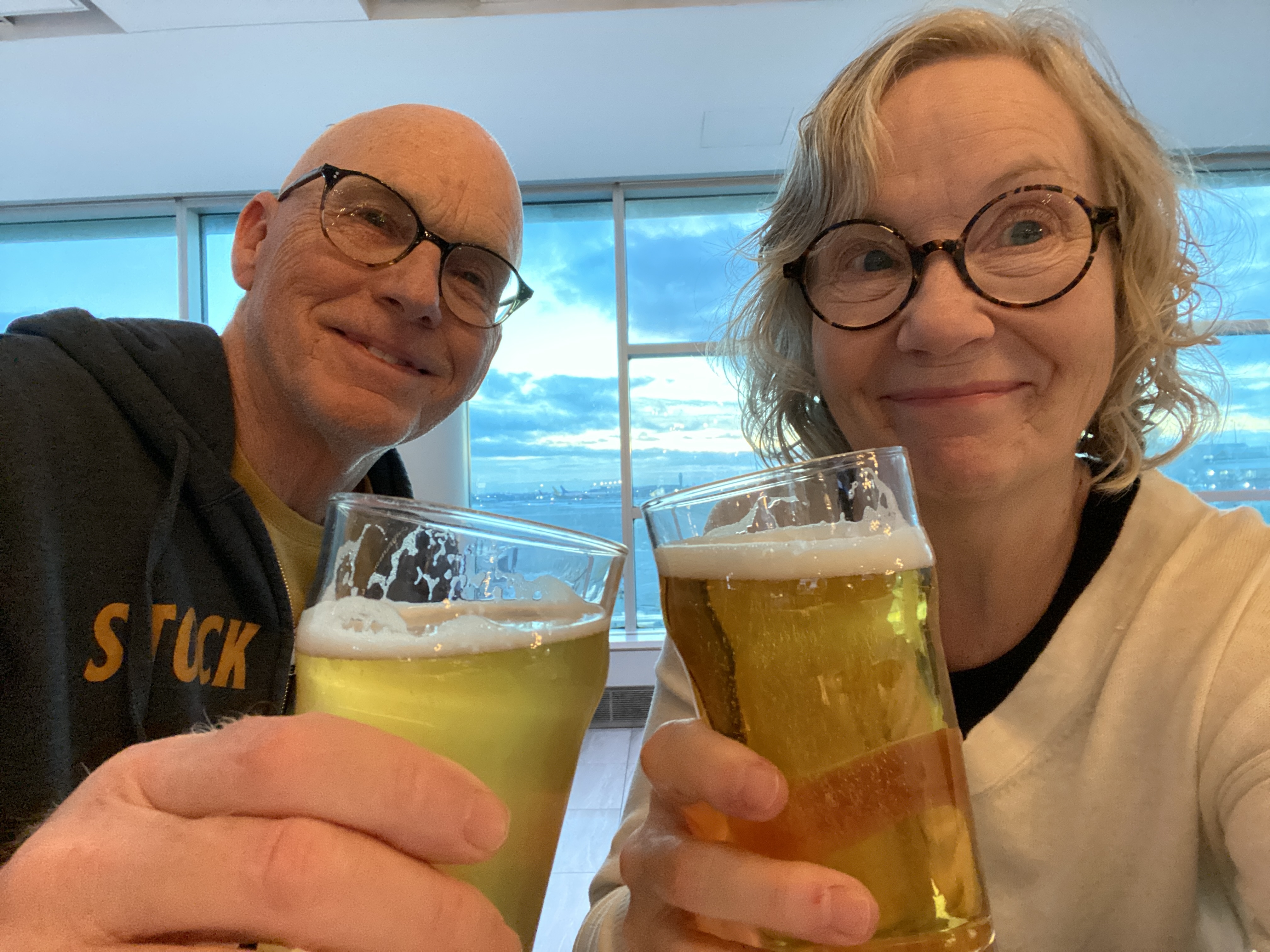 We were up early and Mary drove us to the train station in Sarnia. We took VIARail to Union Station, then the UP train to the airport. We were too early to check in and clear security so we had a nice lunch at the Sheraton. We celebrated finally getting through security and to the ‘good’ side of the airport with a beer. Our flight was delayed by two hours. We won’t bore you with the details other than to say that we’ll definitely consider upgrading our seats next time.