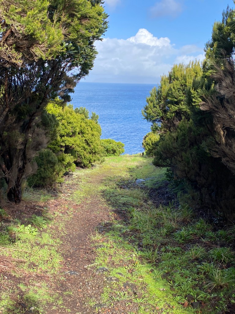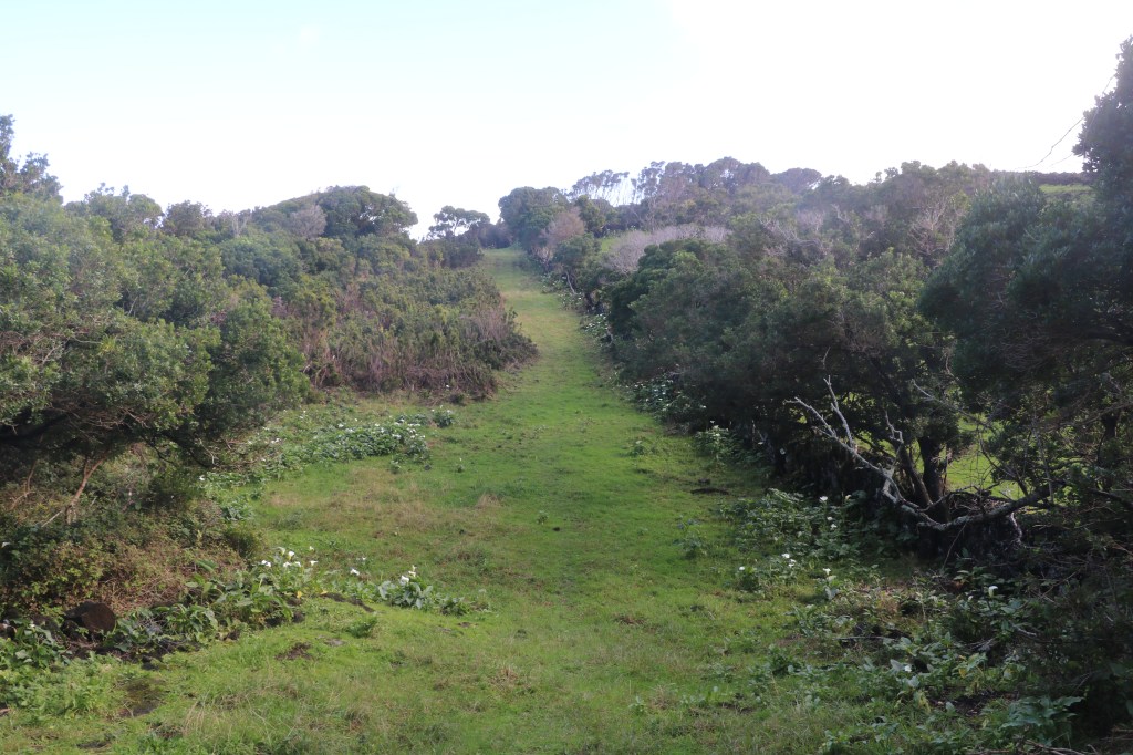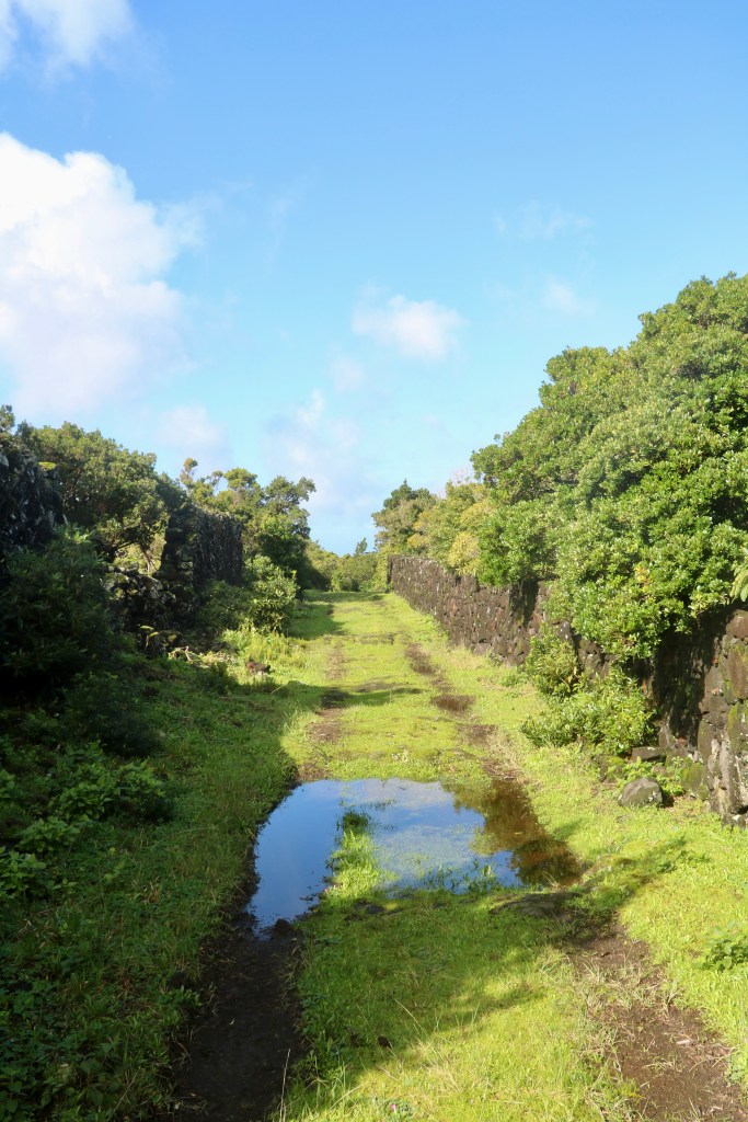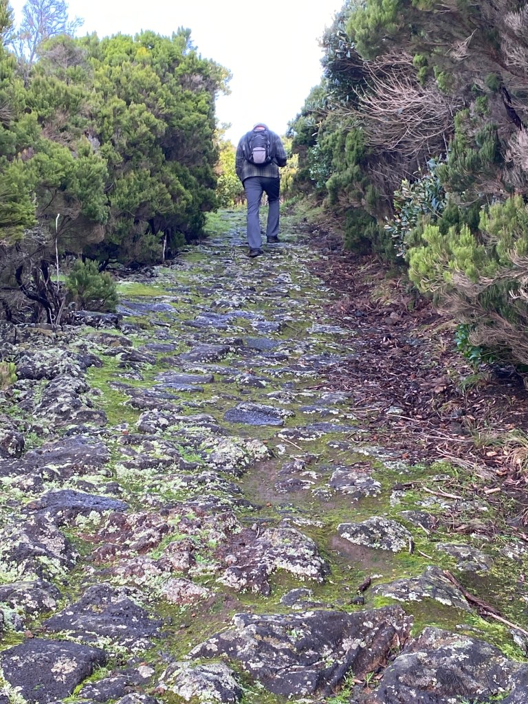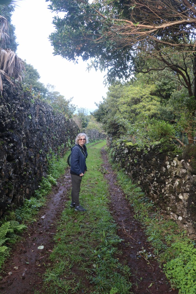 The hike description mentions a path that leads to an old whale lookout tower. When Pico was a whaling island, a man would use binoculars to spot whales passing by and set off a flare to alert the villagers. Boats would be launched, the whale hunted and brought to shore for processing. The blubber was boiled down to make oil lamps, soaps, margarine and machine oil. The products were sold across the world. Whaling was outlawed in 1984, and Pico is now a hot spot for whale watching tours. Anyway, we hiked up to this lookout tower, but there was a notice attached that looked important. Sue used Google Translate on her phone and discovered that the sign is a warning about not staying too long because of high radio frequencies. The structure was quite overgrown and it didn’t appear to have a good view, so we turned around and skedaddled on out of there.